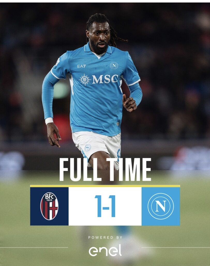 Il Napoli pareggia 1-1 al Dall’Ara al termine della solita partita dai due volti. Gli azzurri dominano nel primo tempo, poi spariscono nella ripresa e il Bologna trova il pari con Ndoye che legittima la bella prestazione dei padroni di casa, bravi a rimontare il vantaggio iniziale del Napoli realizzato da Anguissa. La squadra di Conte – squalificato, in panchina c’è Stellini – parte molto bene. Lukaku mette in difficoltà la difesa avversaria e il vantaggio è la logica conseguenza di una prova di grande autorità. McTominay ha un’altra grande possibilità, ma Ravaglia – entrato al posto di Skorupski – dice no. Nella ripresa il Bologna mette alle corde il Napoli, pareggia con il colpo di tacco di Ndoye e mette in difficoltà gli azzurri che non riescono mai a cambiare ritmo. Ci prova soltanto Raspadori alla fine, ma è troppo poco per provare a vincere la partita. Il Napoli resta a -3 dall’Inter.