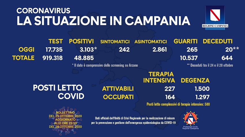 I dati forniti ieri dall’Unità di Crisi Regionale hanno mostrato un rialzo del numero dei positivi al Sars Cov-2 in Campania. Su 17.735 tamponi esaminati, 3.103 sono risultati positivi. Antonio Postiglione, capo dell’equipe medica dell’Unità di Crisi per il COVID19 della Regione Campania, ha dichiarato all’Ansa che “La domanda di posti letto cresce in maniera esponenziale e stiamo cominciando ad ampliare l’offerta aprendo a convenzioni sul covid con gli ospedali privati accreditati e gli ospedali religiosi”. Giuseppe Galano, responsabile del 118 di Napoli e coordinatore della rete regionale, ha dichiarato all’Ansa che l’altra notte “le difficoltà dei pronto soccorso sono state notevoli, ci sono state attese in qualche caso di due ore in ambulanza, dove comunque i pazienti vengono assistiti. Ieri, invece, ha aggiunto Galano, “la situazione è migliorata”. A causa di un focolaio da COVID-19 ha chiuso il commissariato di Aversa, in provincia di Caserta. L’Unità di Crisi, infine, ha raccomandato fortemente la chiusura dei cimiteri per il primo e due novembre.