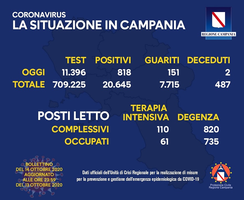 Picco di contagi da Sars Cov-2 ieri in Campania: 818 positivi su 11.396 tamponi eseguiti. I dati dell’unità di Crisi Regionale hanno segnalato anche due vittime e ben 151 guariti. Il saldo tra guarigioni e nuovi contagi fa segnare un aumento di 667 casi, avvicinandosi così alla soglia incrementale di 800 casi indicata la settimana scorsa dal governatore De Luca come limite oltre il quale “chiudere tutto”. Sempre ieri il direttore dell’Asl Napoli 3, Sosto, ha evidenziato la situazione posti letto del Covid Hospital di Boscotrecase. Sosto ha parlato di 47 posti ordinari occupati su 54 disponibili, 15 su venti in subintensiva e cinque su 13 in terapia intensiva. Quello che al momento preoccupa di più – sottolinea il direttore generale della Napoli 3 Sud – sono in particolare i ricoveri ordinari.
