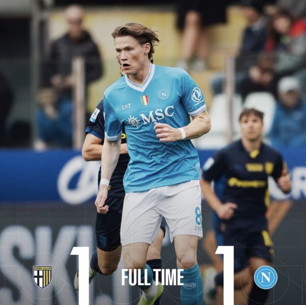 Finisce 1-1, il sogno scudetto, in attesa di Como-Inter, sembra svanito definitivamente. Il Napoli manca la sesta vittoria di fila e il pari appare giusto, anche se il Parma ha di nuovo optato per un legittimo ma ostruzionistico e clamoroso ‘catenaccione’, con un fortino creato con 10 uomini nei primi 35 metri della propria metà campo. Una sorta di ‘anti-calcio’. Tuttavia il Napoli ha deluso, pur se nelle statistiche vanta il 74% di possesso palla, 1.21 di xg (rispetto allo 0.19 del Parma) e 20 tiri a 3, dei quali 6 in porta. Insomma ci ha provato con generosità. Ma ci sono stati poca furia, poca aggressività e scarsa intensità. Non convincono, stavolta, le scelte di Conte di non schierare Alisson dal 1’, di non inserirlo nell’intervallo e di non aggiungere Giovane a Hojlund, magari togliendo uno dei tre centrali difensivi, contro l’unica punta ducale. Secondo posto a +3 sul Milan, vantaggio sulla quinta per ora di 8 (in attesa del Como).