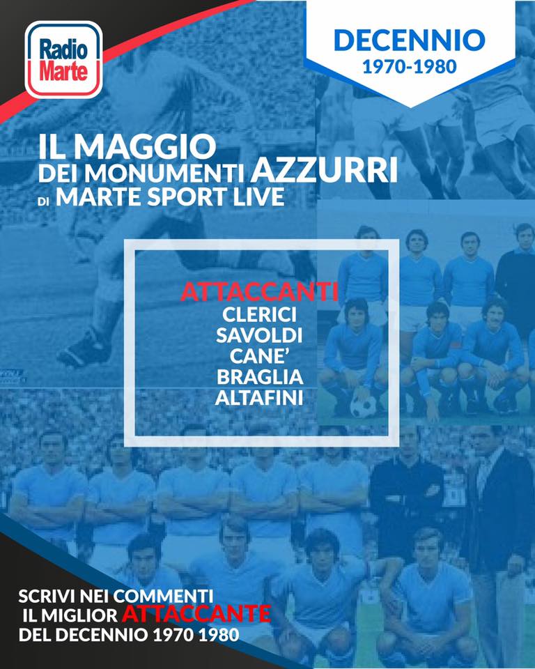 Ogni settimana si può votare un periodo storico con le nomination tra cui scegliere i migliori, divisi in 5 categorie: portieri, difensori, centrocampisti, attaccanti e allenatori. Si parte con il decennio 1970-1980 e oggi, in Marte Sport Live, è stata lanciata la categoria attaccanti: chi tra Altafini, Clerici, Savoldi, Braglia e Canè è stato il migliore del decennio? E’ possibile ancora votare sui social, taggando @radiomarte e con l’hastag #MaggiodeiMonumentiAzzurri. Infine ogni giorno, in Marte Sport Live (in onda dalle 13 alle 14 in questo periodo) saranno “convocati” i calciatori delle diverse epoche per esprimere la loro preferenza. E lo stesso dicasi per giornalisti e opinionisti. A fine settimana, raccolti i voti, ci sarà la top 5 e a fine mese un riepilogo completo.Il “Maggio dei Monumenti Azzurri” è appena iniziato! #MaggiodeiMonumentiAzzurri