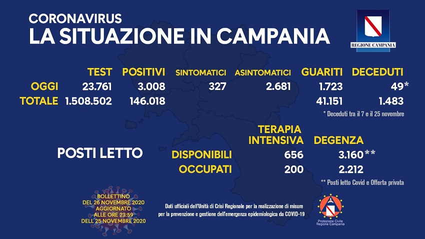 La curva dei positivi al Sars Cov-2 ieri in Campania è leggermente aumentata rispetto ai giorni scorsi: 3008 su 23.761 tamponi esaminati. Il rapporto tra positivi e tamponi è stato del 12,6 per cento rispetto al 12,1 dell’altro ieri e al 12,8 di martedì. I deceduti sono 49, tra il 7 ed il 25 novembre mentre i guariti 1.723. Intanto, Domenico Rubino, sindaco di Sassano in provincia di Salerno, positivo al COVID dal 18 novembre, è stato ricoverato all’ospedale di Polla. Il dottore è anche responsabile dell’area COVID del suddetto ospedale. In un messaggio ai concittadini il sindaco di Sassano ha detto di star bene e di essere tranquillo anche perché “ho ritrovato i miei colleghi ed infermieri che sono un esempio per tutti noi di serietà, gentilezza e professionalità”. Con l’occasione – ha scritto ancora Domenico Rubino – “invio un caro saluto ed un abbraccio ai miei straordinari assessori e consiglieri comunali che continuano a lavorare per assicurare tutti i servizi essenziali”.