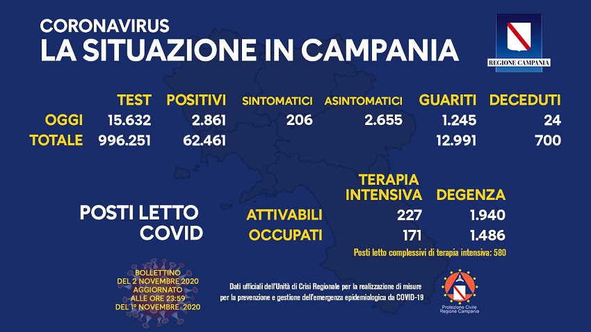 2.861 è il numero di positivi al Sars Cov-2 in Campania comunicato ieri dall’Unità di Crisi Regionale che ha aggiunto che 15.632 sono stati i tamponi eseguiti. Dei nuovi positivi 206 sono i sintomatici, mentre 24 sono stati i decessi. Preoccupano anche i numeri dei ricoveri ospedalieri: 1.486 ricoverati con sintomi, 70 in più dell’altro ieri, e 171 malati in terapia intensiva, uno in più dell’altro giorno. Di contro, cresce il numero di pazienti guariti. Sempre ieri, nel parcheggio dietro il Pronto Soccorso dell’Ospedale Cardarelli, la Croce Rossa ha montato una tenda che ospiterà 20-25 letti per la degenza da COVID-19. Ancora ieri, al termine della Conferenza Stato-Regioni, il presidente De Luca ha chiesto al Governo l’estensione dei congedi parentali, la concessione di un corrispettivo bonus famiglia per i lavoratori autonomi, l’adozione di misure di prevenzione e contenimento del contagio che siano semplici e di carattere nazionale, un piano straordinario di controllo da parte delle forze dell’ordine per il rispetto delle ordinanze e, infine, assoluta contemporaneità delle misure del Governo di contenimento dell’epidemia.