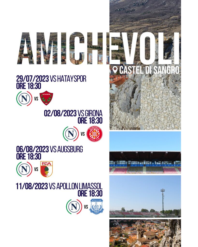 Il Napoli disputerà quattro amichevoli nel corso del ritiro a Castel di Sangro che comincerà venerdì 28. Questo il programma delle partite. Tutte sono in programma allo stadio Teofilo Patini.